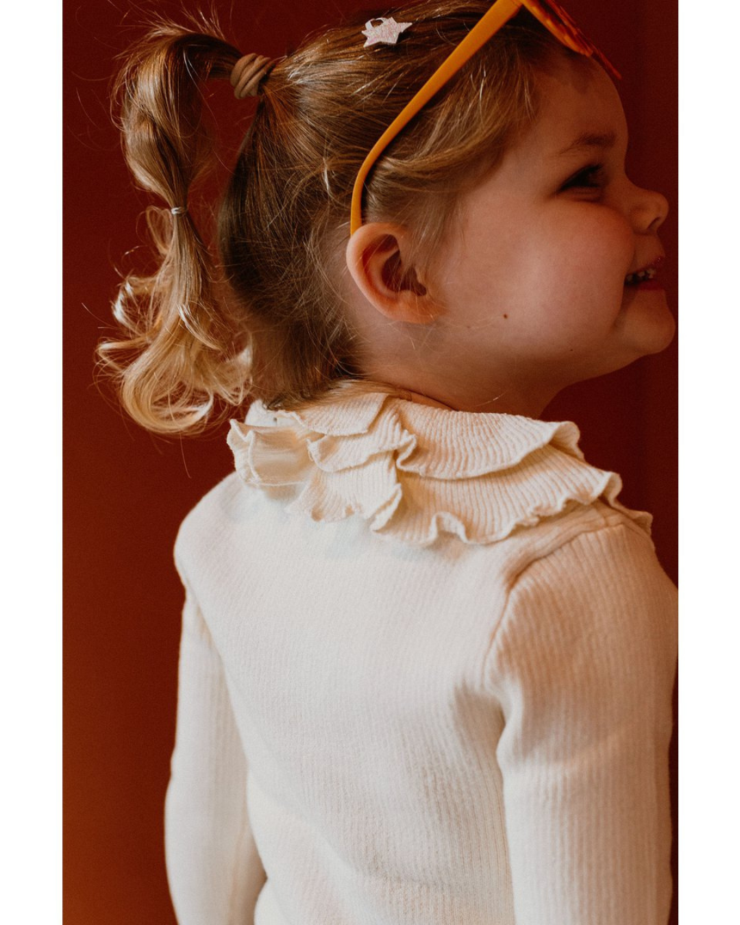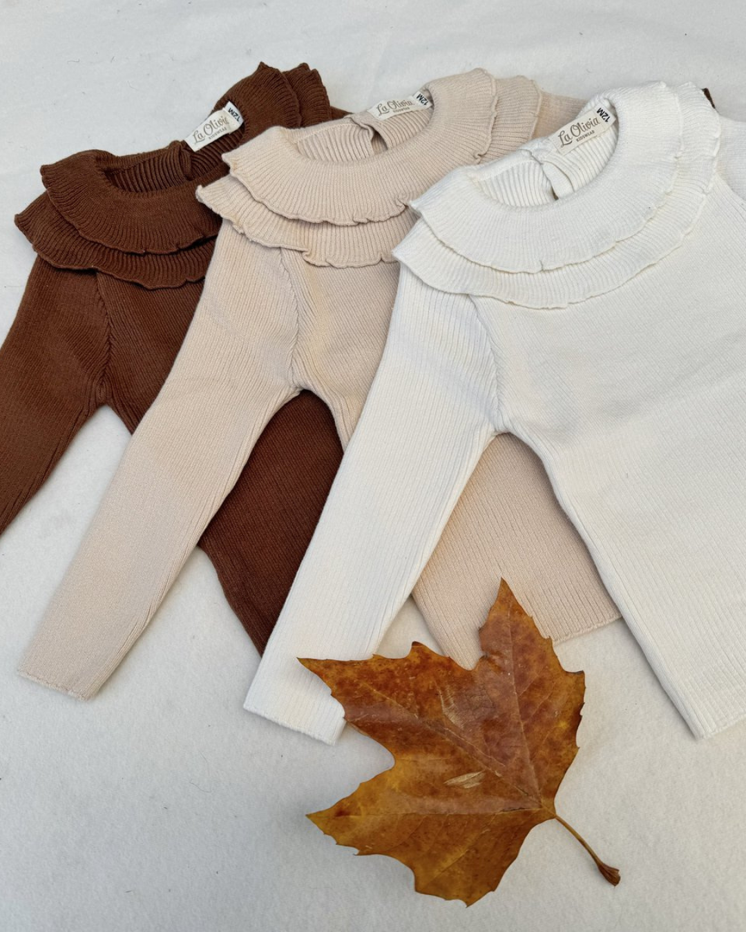 Deze schattige geribde gebreide tops zijn perfect voor herfst- en winterseizoenen. Ze hebben een delicate dubbele halslijn met ruches en voegen een vleugje charme en elegantie toe aan elke outfit. Deze top is verkrijgbaar in twee kleuren (beige en wit) en zijn ideaal om als laagje te dragen of om zo te dragen. Ze zijn gemaakt van zachte, comfortabele stof.