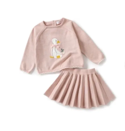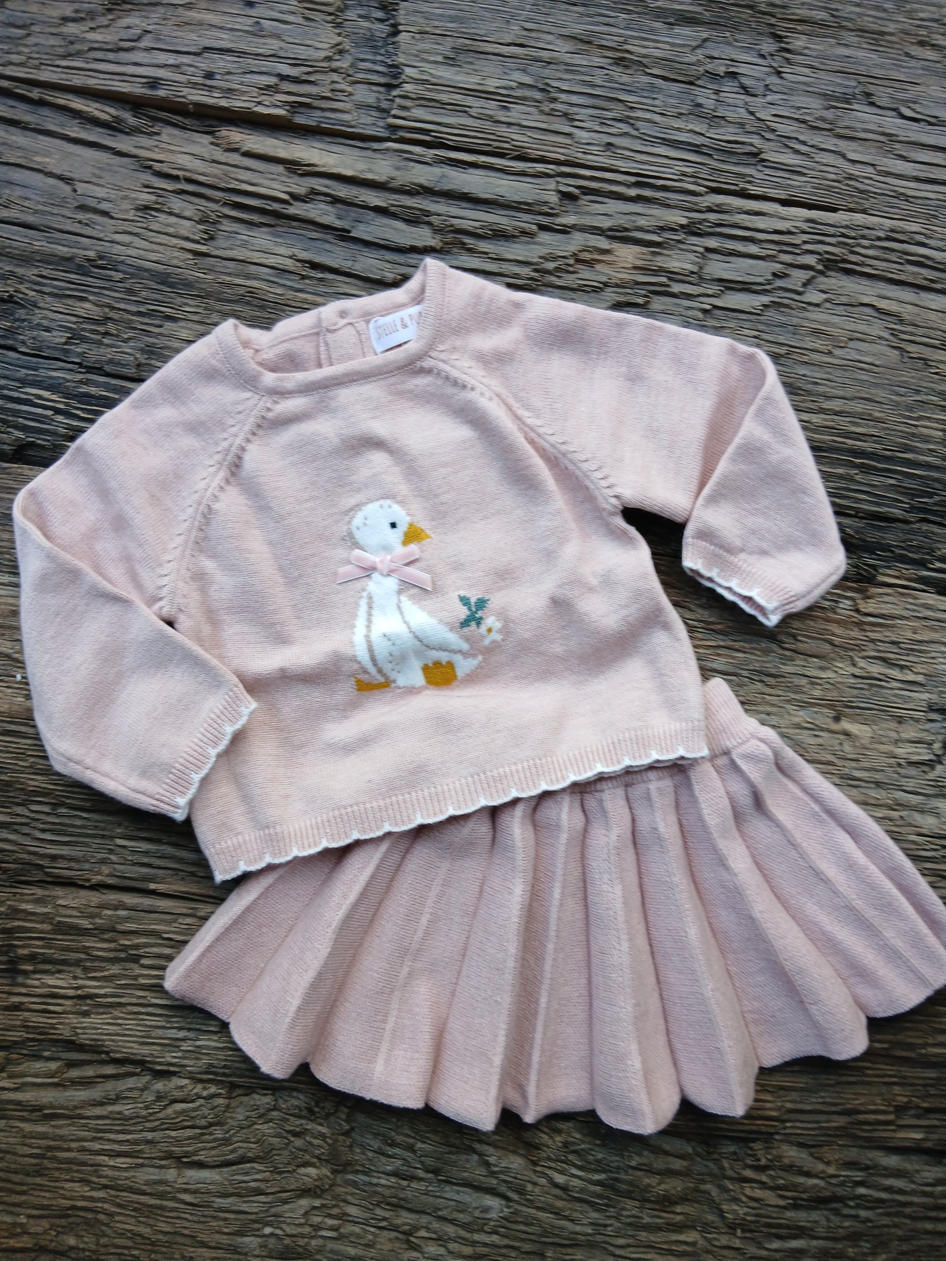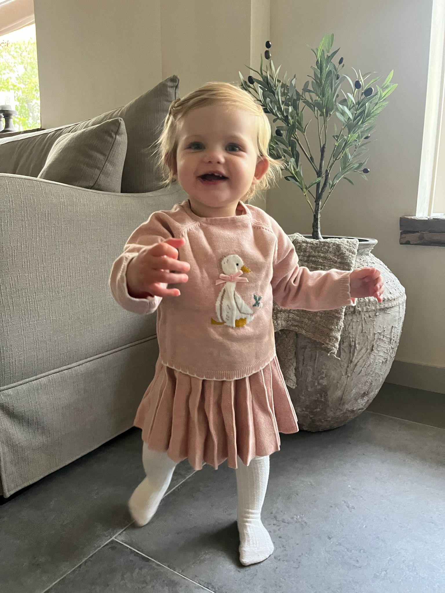 Hoe schattig is dit roze setje! Het bestaat uit een zachte trui met een lief eendje op de voorkant en een mooi geplooid rokje in dezelfde kleur. De trui voelt heerlijk zacht aan! Het rokje heeft een soepel vallend model dat leuk meebeweegt bij elke stap of draai. Perfect voor een dagje spelen of een vrolijk uitje!