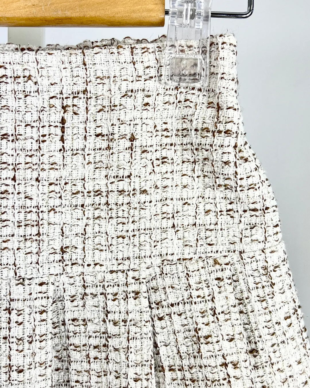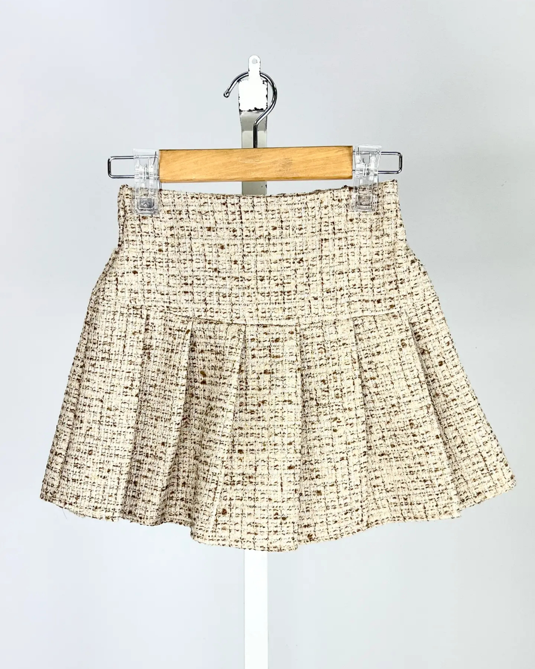 Deze camel plooirok is gemaakt van een zachte tweedstof met speelse bruine spikkeltjes en gouddraad. De plooien zorgen ervoor dat het rokje mooi meebeweegt bij elke stap – perfect om in te draaien, dansen en spelen!